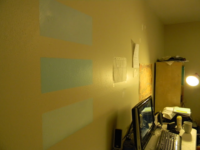 Got the ppl at Ace Hardware to mix me a new colour. It has the mellowness of Aqua Glass and the edge of yellow of Schooner Bay. I'm going with it.
